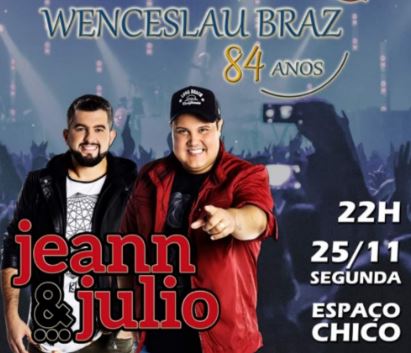 Em comemoração ao aniversário da cidade, se apresenta hoje a noite no Espaço Chico, uma das melhores duplas sertaneja da atualidade: Jeann e Julio. A entrada é gratuita.
